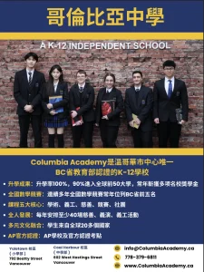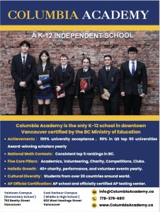 Columbia Academy offers Kindergarten to Grade 12 programming, proudly accredited by the BC Ministry of Education. Our mission is to prepare students for acceptance into the world’s top universities while fostering the development of well-rounded individuals equipped to become tomorrow’s leaders